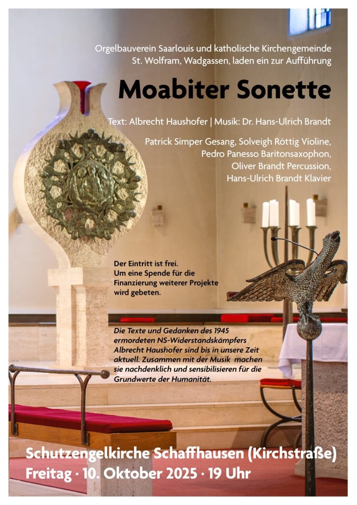 Zunächst am 10. Oktober in Schaffhausen (Saarland) eine weitere Aufführung der Moabiter Sonette, bei deren Uraufführung in Berlin ich im Januar 2010 auch schon beteiligt war.