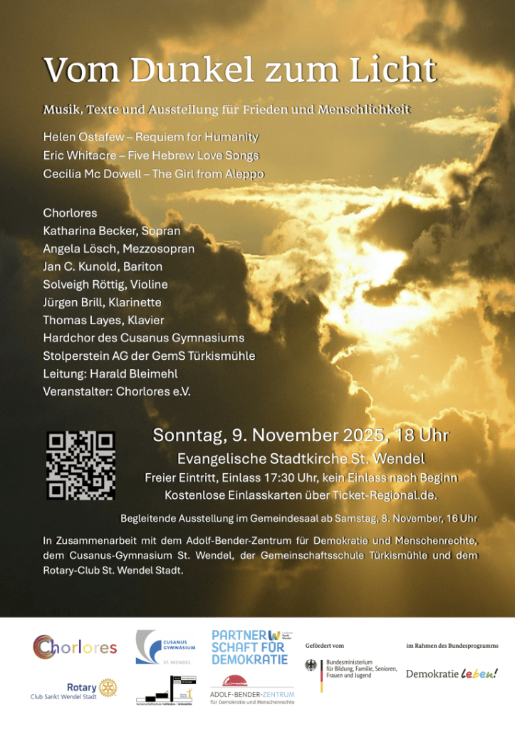 Am 9. November in St. Wendel folgt anlässlich des Jahrestags der Reichsprogromnacht eine Wiederholung des Konzerts „Vom Dunkel zum Licht“, zusammen mit dem Chor Chorlores. Unter anderem mit „The Girl from Aleppo“ von Cecilia Mc Dowell und „Five Hebrew Love Songs“ von Eric Whitacre. Beide Werke voller Solopassagen für Violine, da gibt es viel zu tun für mich.