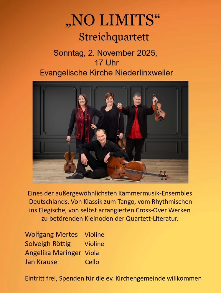 Ein genreübergreifendes Konzert spielen wir mit dem NO LIMITS Streichquartett am 2. November in Niederlinxweiler. Mit Wechseln von Klassik zu Tango, vom Rhythmischen ins Elegische und von selbstarrangierten Cross Over Werken zu betörenden Kleinoden der Quartettliteratur.