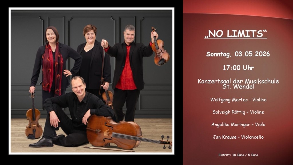 Ein weiteres Frühlingskonzert folgt einen Tag später, am 3. Mai, mit unserem NO LIMITS Streichquartett im Konzertsaal der Musikschule St. Wendel.